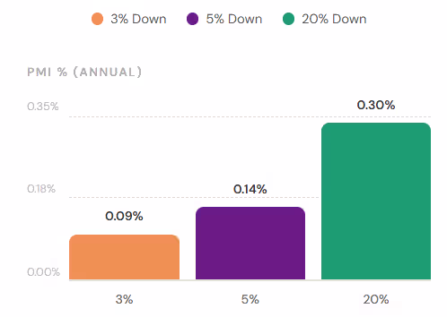 - 5% Down Payment: Considerably lowers your risk and can reduce your rate compared to 3%, but the larger impact is in PMI reduction of almost 40%.