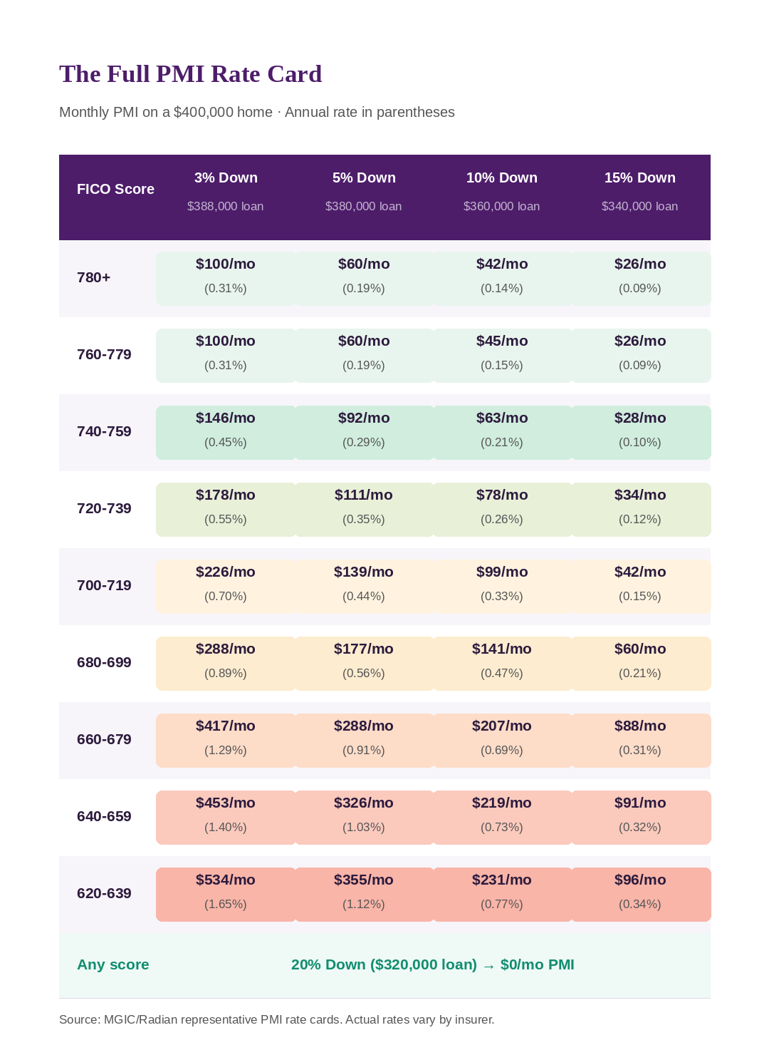 PMI ranges from about $26 to over $500 per month, depending on your credit score, down payment, and loan amount. On a $400,000 home with 5% down, monthly PMI runs from $60 (760+ score) to $355 (620 score). Most buyers with good credit (700+) pay between $45 and $140 per month.