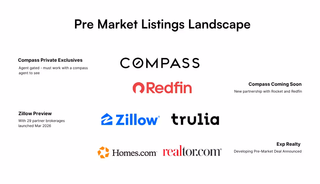 Compass and Redfin formed a pre-market partnership. In February 2026, Compass struck a deal with Redfin (now owned by Rocket Companies) to display Compass's "Coming Soon" and "Private Exclusive" listings on Redfin's platform. These listings had previously been visible only on the Compass site or through Compass agents. If you're searching on Redfin, you now have access to inventory that was off-limits a few months ago.