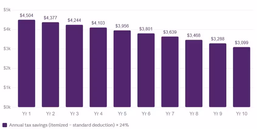 As the chart shows, this advantage narrows over time as mortgage interest decreases. But over 10 years, a homeowner in this scenario could save approximately $36,000 compared to taking the standard deduction every year.