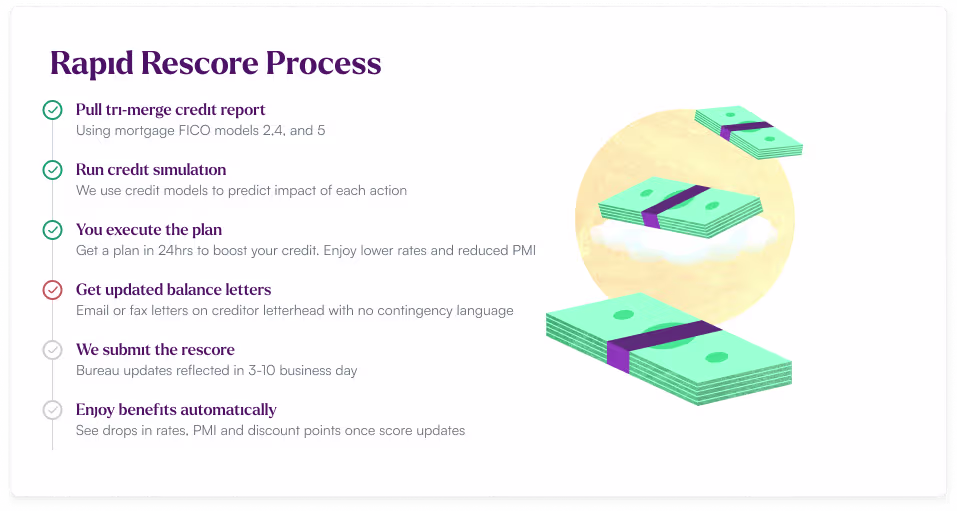 A rapid rescore is the fastest legitimate way to improve your mortgage credit score — turning 30–45 days of waiting into 3–14 days of action. It can't fix everything, but for borrowers with fixable issues (high utilization, outdated balances, errors, authorized user problems), it's the difference between getting the rate you want and settling for less.